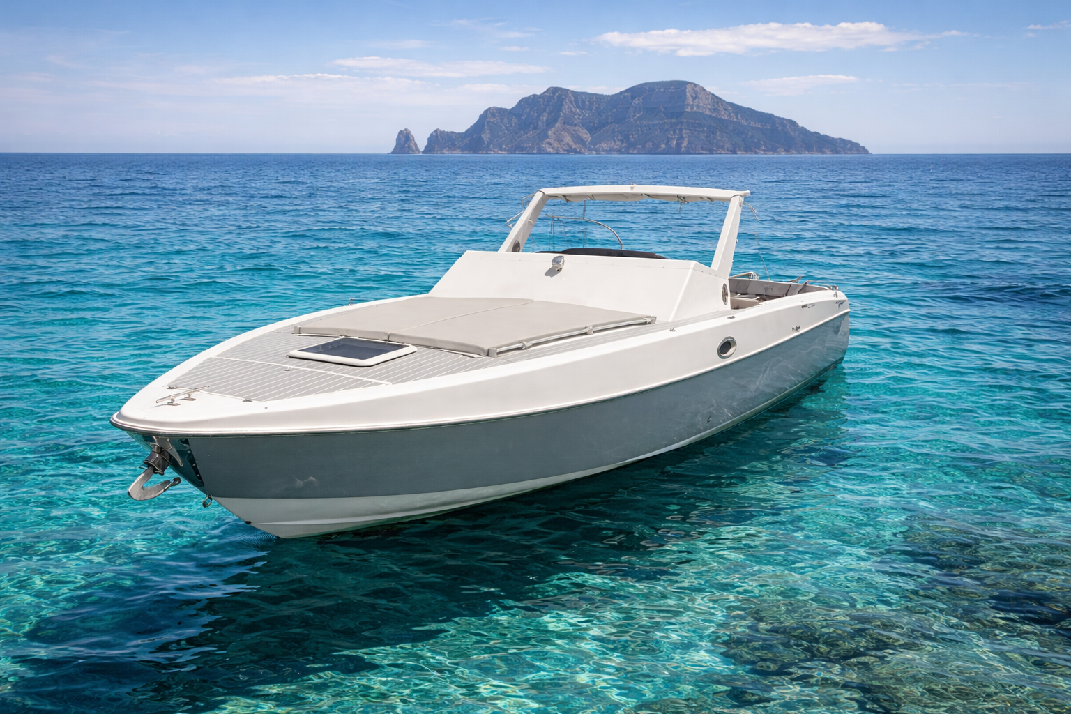 Your own 10.8m boat along the coast. Capri, Procida, Amalfi — your itinerary, your pace. Up to 8 guests.